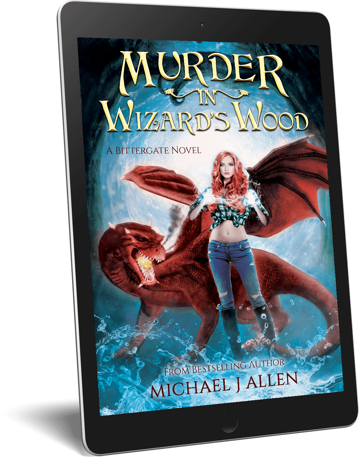 In the meantime, ​I've engaged an artist I found to build the Forge of War cover for us. Lucky for us, the endeavor expanded to include all four ​Bittergate covers (finally replacing my attempts ​to be a cover artist.) The first of those is ready, giving us Lanea and young Drake on the newest cover version ​for Murder in Wizard's Wood.